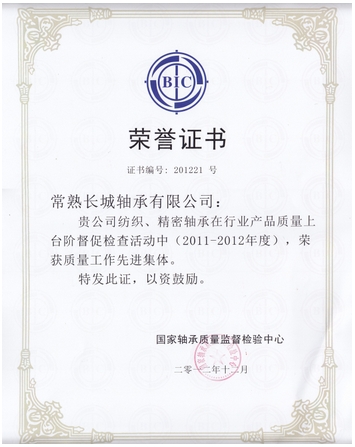 由國家軸承質(zhì)量監(jiān)督檢驗中心組織的紡織、精密軸承在行業(yè)產(chǎn)品質(zhì)量上臺階督促檢查活動中(2011--2012年度),常熟長城軸承有限公司榮獲質(zhì)量工作先進集體。(常熟長城軸承有限公司)
