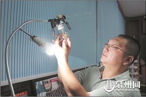 林福文向記者介紹陶瓷燈絲的優(yōu)點(diǎn)